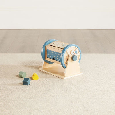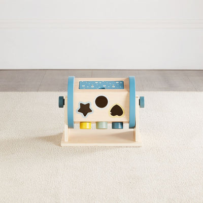 Your baby will rock and roll with our wooden Activity Roller. This perfect tummy time toy can either sit in the base and whirl and twirl, or roll freely on the floor. This quality interactive toy features a shape sorter with heart, star and circle shapes and a functioning door that opens to store and retrieve shapes , 3 noisemaking knobs, 3 graphic abacus blocks, and an acrylic mirror. The sides of the cylinder boast floating discs enclosed in acrylic. Our Activity Roller will stimulate all the senses during playtime!