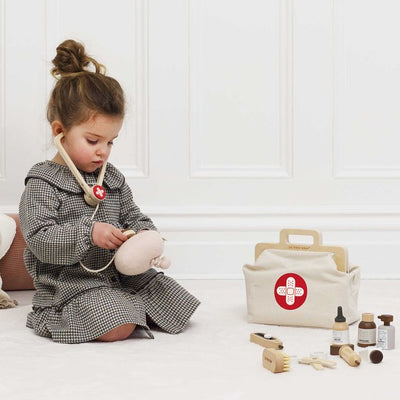 Our Animal Care Set is the perfect companion for imaginary pet owners and animal lovers alike! This veterinarian-inspired set includes a vintage style storage medical aid bag, which is equipped with everything required to give any animal the best of care! Featuring a sleek walnut stain finish and adorned with touches of natural FSC - Certified wood, the 10 accessories forming this set are unlike any others. Items included are; soothing paw balm, ear drops, medicine bottle, pet shampoo, stethoscope, dressing scissors, a syringe, and a soft eco bristle brush. We are proud of the fact this set is plastic free! Bring the world of career-based role play into any home with this perfect play set.
