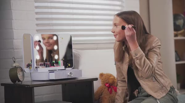 Every little girl needs her first makeup kit! Teach her how to apply blush, polish her nails or add sparkle to her eyes with the 24-Piece LED Vanity Makeup Studio from FAO Schwarz! But more than that, you’ll show your child or friend how to unleash artistic creativity with the right tools for them! All the pieces she needs for crafting her new look from start to finish are included. This set features foundation, primer, blush, lipstick, nail polish, brushes, and a mirrored vanity to keep it all in. To get started on your makeover, we’ve included a makeup application sheet with tips for mastering your desired look. Lighting is key to producing a glowing look! Insert batteries (not included) into the back of the tri-fold vanity mirror to provide your child with extra lighting. A small button on the back turns the light on and off to preserve battery power.