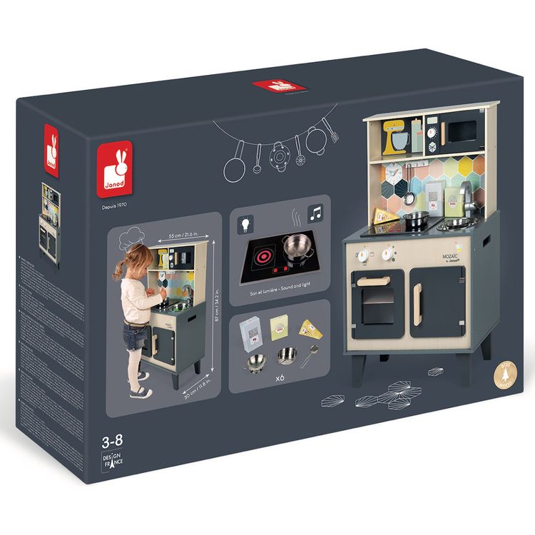 Prepare tasty little dishes for your friends, just like mom and dad, and become a Little Chef!!! Mozaïc big cooker is made from wood and has a utensil hook for hanging 1 skimming ladle, 1 saucepan and 1 metal colander, and 3 cardboard food boxes (cheese, flour, rice). Just like a real kitchen, it has a hob complete with LED and sound effect: simply press the red buttons once to see the hob rings light up, then a second time to hear water boiling. The sound and hob rings switch off automatically after 30 seconds or by pushing the red buttons a third time. This fantastic, fully equipped kitchen also has an oven, a microwave, a cupboard, 3 knobs with sound effects, a stainless-steel sink and a clock. 2 LR6 - 1,5V alkaline batteries required (not included).