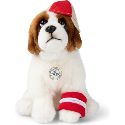 - This St. Bernard dog plush toy sports a baseball cap and a sweatband.