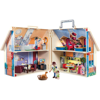 - This take-along case opens up to reveal a two-story house with four fully-furnished rooms.