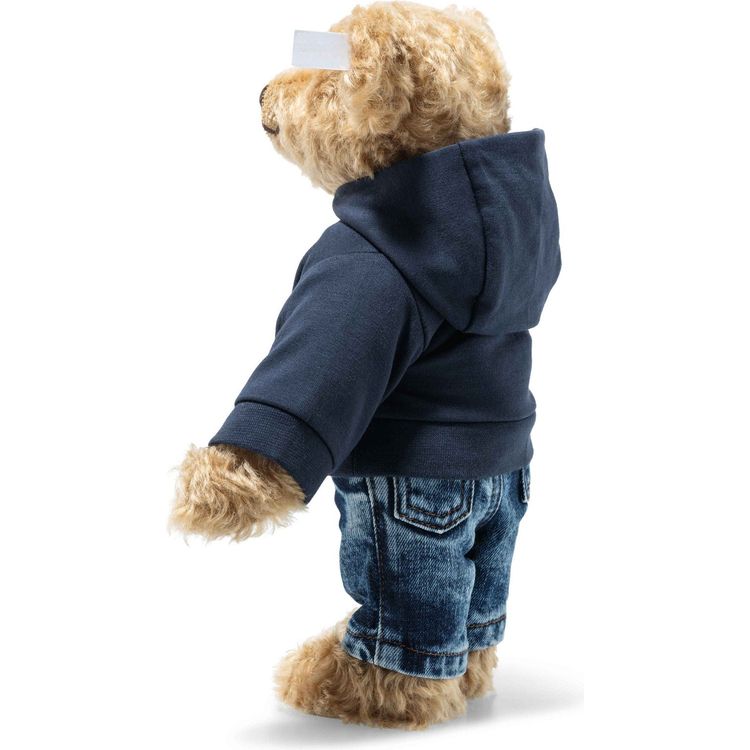 Meet the ninth addition to our “Great American Teddy Bear” series: He’s a little boy bear who’s dressed to show his American pride. The Great American Bear is attired in an “unofficial” uniform which can be found in the wardrobe of almost every American: a classic pair of jeans and a comfortable hoodie. Naturally, the Teddy bear’s outfit appropriately features shades of red, white, and blue. He wears an intricately handmade pair of denim jeans that are inspired on a legendary style from the early 1900’s - a design that’s still popular today. Likewise, the Great American Teddy bear’s body style is a version of a 1909 Steiff design. He’s sewn from RMS-certified blonde mohair, and fully jointed. His feet are carded so he can stand - allowing him to proudly show off his hoodie. His shirt is emblazoned with the letters “USA,” with each letter showing the stars and stripes of the American Flag in the background. There’s no better way to celebrate the U.S.A. than with this iconically dressed patriotic Teddy bear.