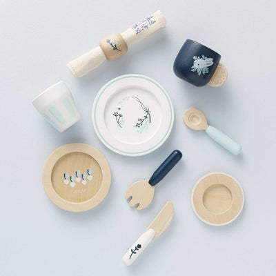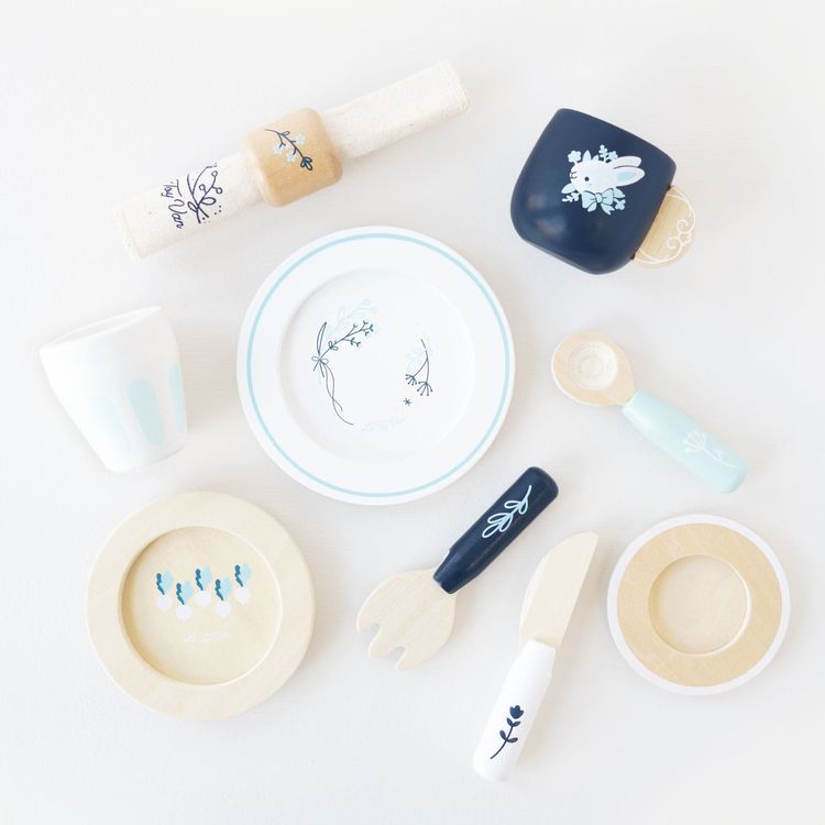 Dinner is served with our stylish wooden cutlery dining set, a wonderful gender neutral toy that's full of fun, sustainable and made to last. Painted in blue and white tones and decorated with pretty botanical illustrations, this cute roleplay toy features a full place setting including mug, coaster, cup, 2 plates, knife, fork, and a spoon., plus a fabric napkin with wooden holder. Teach kids table etiquette and help hone fine motor skills, dexterity and coordination during immersive play. This Dining Set toy is made of FSC®-certified wood (wood from sustainably managed forests) and decorated with child safe water based paints.